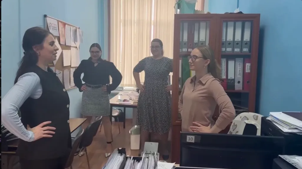 Сотрудники школы сделали перерыв, чтобы взбодриться и зарядиться энергией. Елена Петровна показала комплекс упражнений, который легко выполнить прямо в кабинете или коридоре!